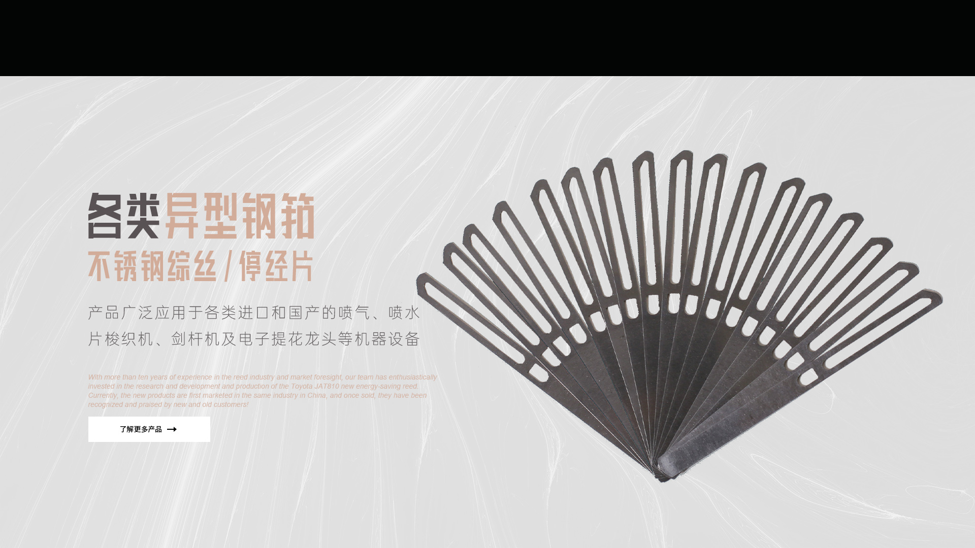 從事研發(fā)生產及銷售各類新型紡織器材的生產型企業(yè)。公司主要產品有:噴氣織機用各類異型鋼筘(傳統型豐田JAT710鋼筘及新研發(fā)的豐田JAT810節(jié)能筘);不銹鋼綜絲及不銹鋼停經片。我們的產品廣泛應用于各類進口和國產的噴氣、噴水、片梭織機、劍桿機及電子提花龍頭等機器設備。